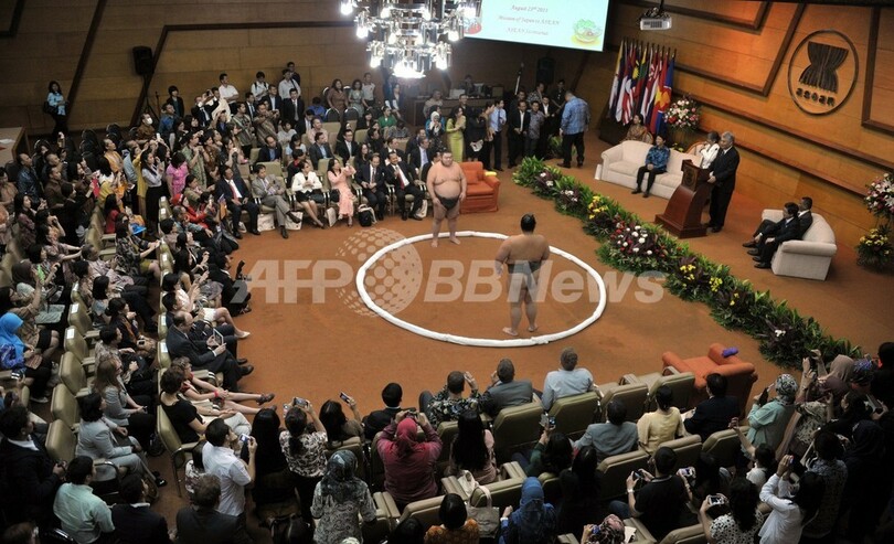 【9月5日 AFP】インドネシアの首都ジャカルタ(Jakarta)で、数千人の観衆が見つめる中、力士と力士の体がぶつかり合う音がスタジアム内に響き渡る。先月末、5年ぶりの海外巡業となる大相撲ジャカルタ巡業が開催された。