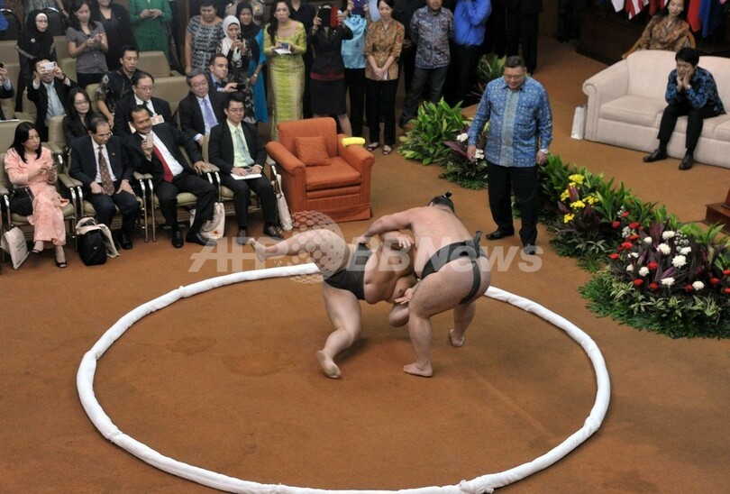 【9月5日 AFP】インドネシアの首都ジャカルタ(Jakarta)で、数千人の観衆が見つめる中、力士と力士の体がぶつかり合う音がスタジアム内に響き渡る。先月末、5年ぶりの海外巡業となる大相撲ジャカルタ巡業が開催された。