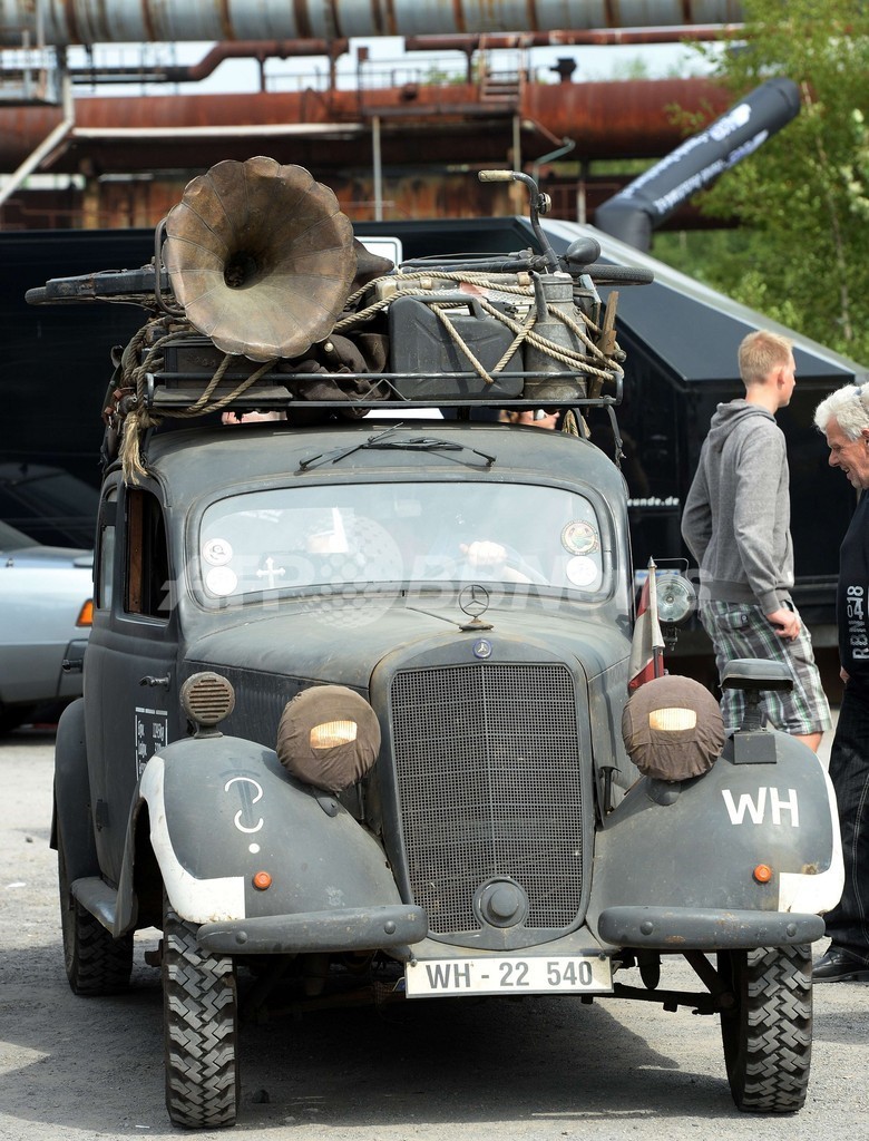 写真は、軍仕様の1940年製メルセデスベンツ170V(Mercedes Benz 170V)を見る来場者(2013年9月1日撮影)。(c)AFP/ PATRIK STOLLARZ