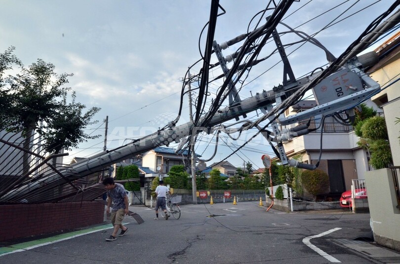 【9月2日 AFP】(写真追加)埼玉県越谷市など関東地方の一部地域で2日、竜巻とみられる突風が発生し、家屋の損壊などにより数十人が負傷した。越谷市内に入ったAFP記者によると、路上には屋根瓦が散乱し、電信柱が住宅に倒れかかるなど大きな被害が出ている。越谷市は、29人負傷、うち3人が重傷と発表した。