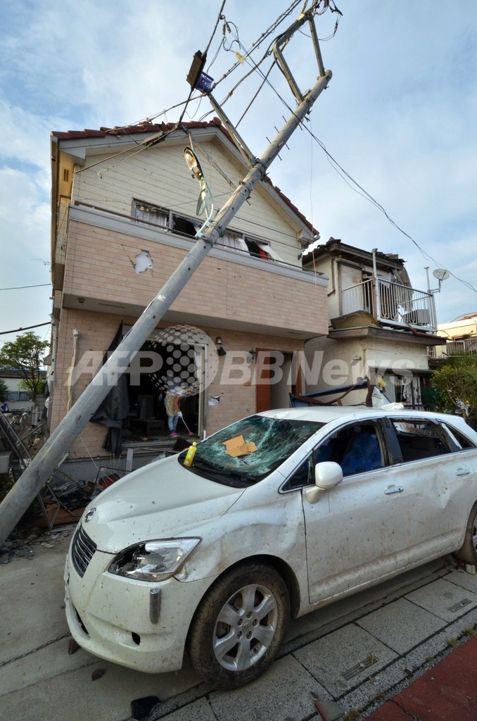 【9月2日 AFP】(写真追加)埼玉県越谷市など関東地方の一部地域で2日、竜巻とみられる突風が発生し、家屋の損壊などにより数十人が負傷した。越谷市内に入ったAFP記者によると、路上には屋根瓦が散乱し、電信柱が住宅に倒れかかるなど大きな被害が出ている。越谷市は、29人負傷、うち3人が重傷と発表した。