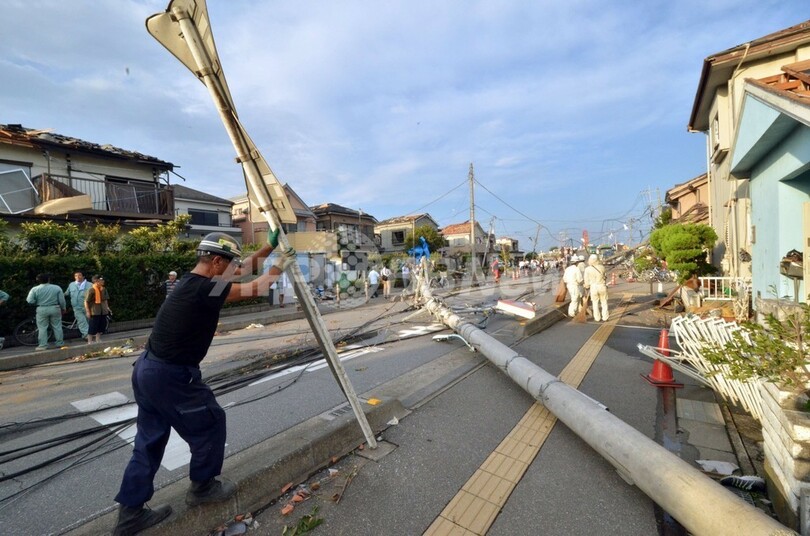 【9月2日 AFP】(写真追加)埼玉県越谷市など関東地方の一部地域で2日、竜巻とみられる突風が発生し、家屋の損壊などにより数十人が負傷した。越谷市内に入ったAFP記者によると、路上には屋根瓦が散乱し、電信柱が住宅に倒れかかるなど大きな被害が出ている。越谷市は、29人負傷、うち3人が重傷と発表した。