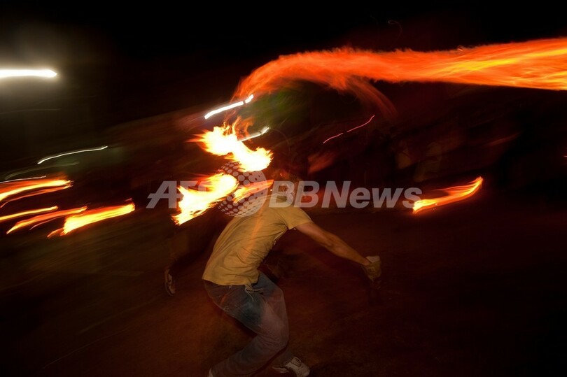 写真は、祭りで火の玉を投げる参加者(2013年8月31日撮影)。(c)AFP/Jose CABEZAS