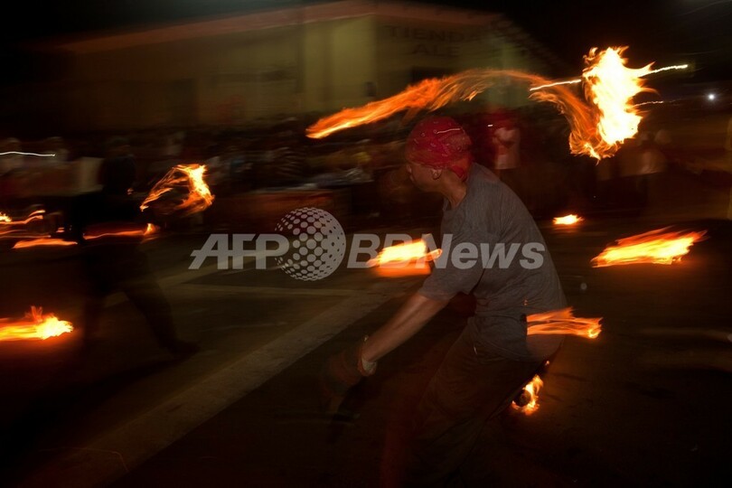 【9月3日 AFP】中米エルサルバドルの首都サンサルバドル(San Salvador)北郊のネハパ(Nejapa)で31日、火の玉を投げ合う祭り「ラ・レクエルダ(La Recuerda)」(追悼の意)が開かれた。この祭りは、1658年に起きたサンサルバドル火山の噴火によってこの街が受けた大被害を思い起こすため、1922年から開催されている。(c)AFP