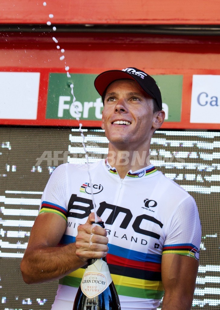 表彰式でシャンパンを振るBMCレーシングチームのフィリップ・ジルベール(2013年9月5日撮影)。(c)AFP/JAIME REINA