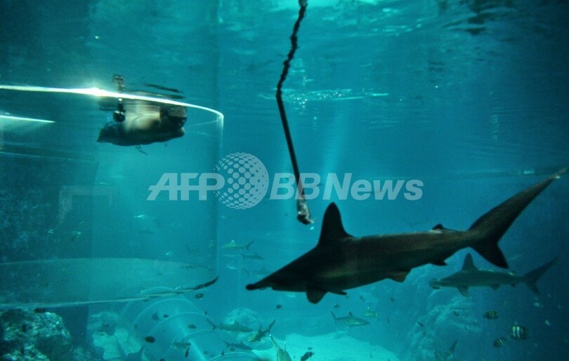 【9月6日 AFP】シンガポール・セントーサ(Sentosa)島のリゾート・ワールド・セントーサ(Resort World Sentosa)にある水族館マリン・ライフ・パーク(Marine Life Park)で5日、生まれつき手足のないオーストラリア人のニック・ブイチチ(Nick Vujicic)さんが、サメの住む水槽の中に特別に設置したアクリル製の囲いの中を泳いでみせた。ブイチチさんは自己啓発の講師としても有名で、今月シンガポールで行う講演には5000人の聴衆が集まる予定だ。(c)AFP