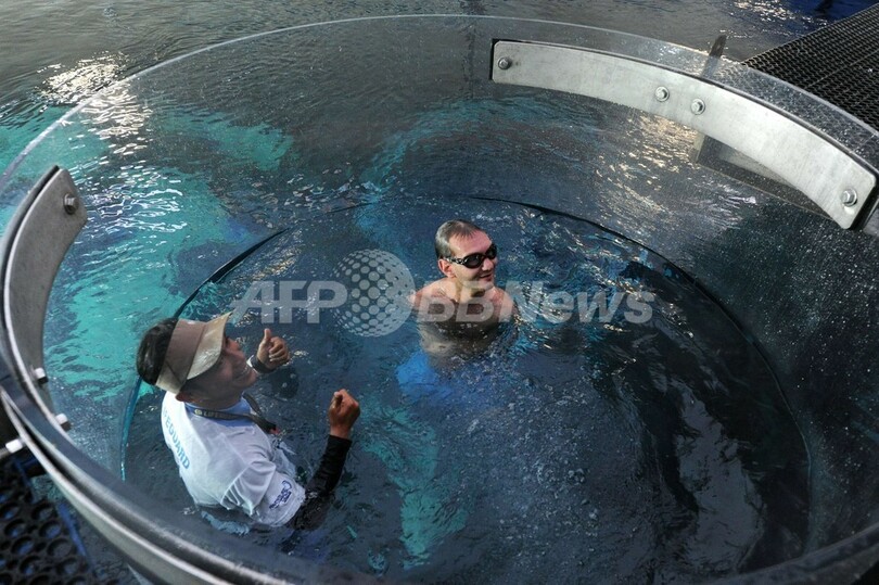 生まれつき手足のない男性、水族館で遊泳に挑戦 シンガポール