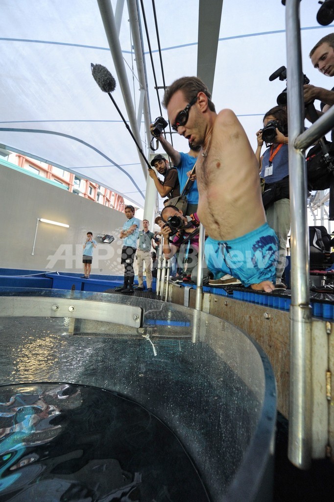 写真は水槽に飛び込むブイチチさん(2013年9月5日撮影)。(c)AFP/ROSLAN RAHMAN