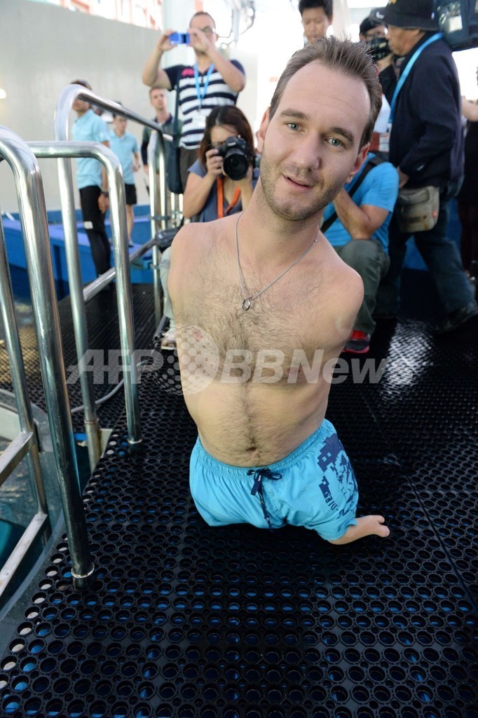 生まれつき手足のない男性、水族館で遊泳に挑戦 シンガポール