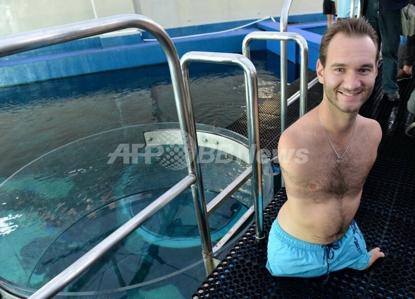 生まれつき手足のない男性、水族館で遊泳に挑戦 シンガポール