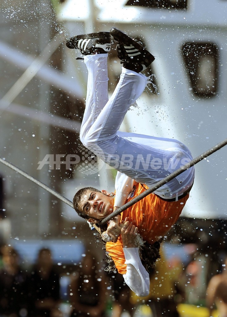 【9月6日 AFP】スペイン北部バスク(Basque)自治州の小さな港町レケイティオ(Lekeitio)で5日、毎年恒例の伝統の祭り「ガンの日(Antzar Eguna)」が開催され、若者たちが次々と水上に張られたワイヤからつり下げられた1羽のガンに飛びついては、水に落ちるまでの長さを競った。