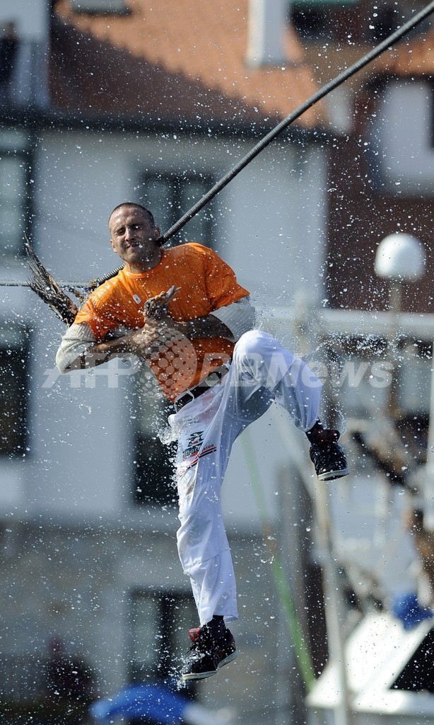 【9月6日 AFP】スペイン北部バスク(Basque)自治州の小さな港町レケイティオ(Lekeitio)で5日、毎年恒例の伝統の祭り「ガンの日(Antzar Eguna)」が開催され、若者たちが次々と水上に張られたワイヤからつり下げられた1羽のガンに飛びついては、水に落ちるまでの長さを競った。