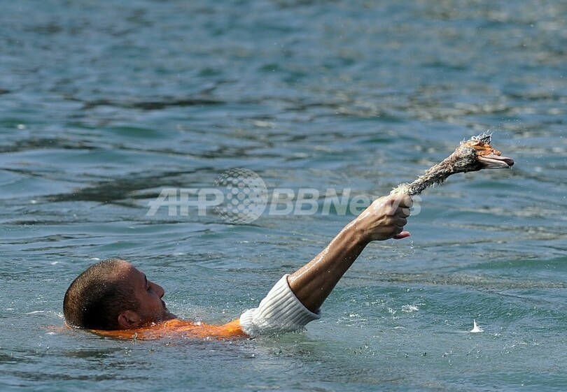 とれたガンの首を泳いで岸辺まで持ち帰ることができた参加者には全員、そのガン1羽が戦利品として与えられる。「ガンの日」は、スペイン各地に残る風変わりな伝統の祭りの1つとして知られ、かつては生きたガンを用いていたという。(c)AFP