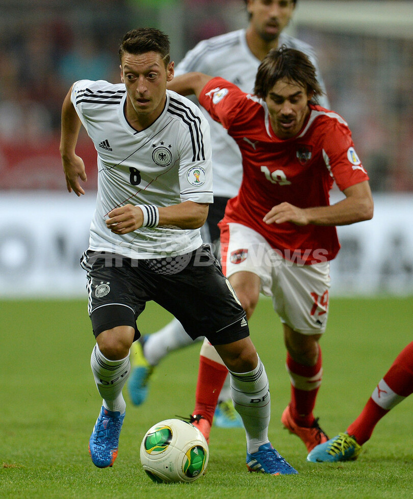 オーストリアのフェリ・カフラク(Veli Kavlak、右)の前でドリブルするドイツのメスト・エジル(Mesut Ozil、2013年9月6日撮影)。(c)AFP/PATRIK STOLLARZ