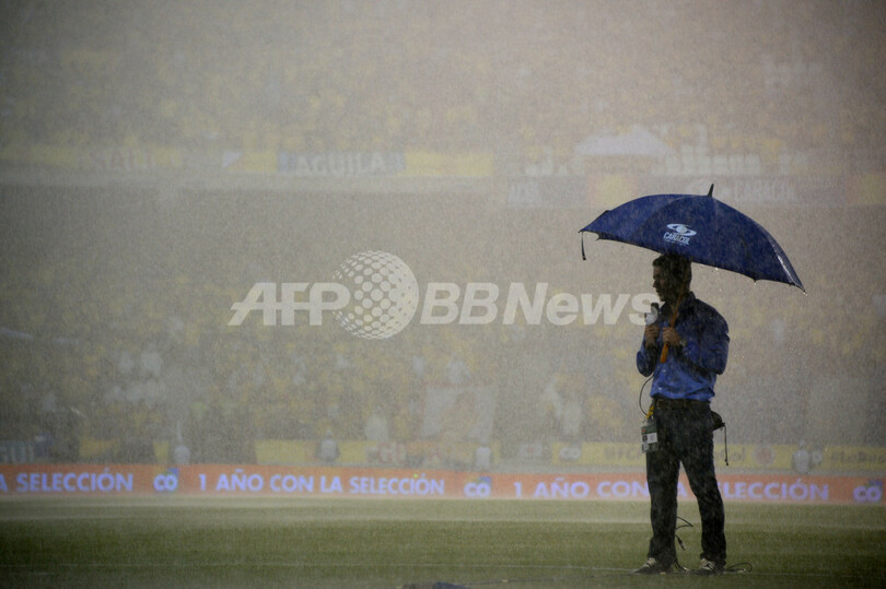 試合前、豪雨の中で中継するテレビのレポーター(2013年9月6日撮影)。(c)AFP/EITAN ABRAMOVICH