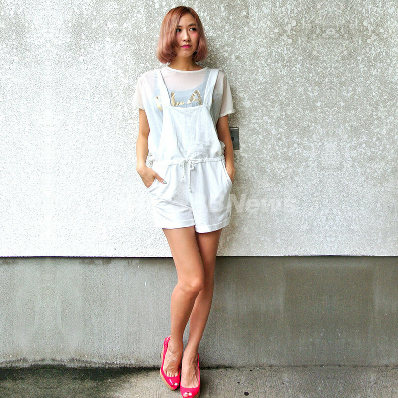 トップスとサロペットを異素材MIXさせたホワイトコーディネート。TSURUのミュールで最後の夏ネオンカラーを取り入れました。