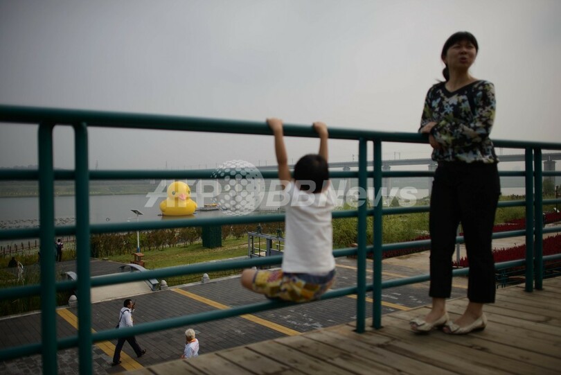 写真は北京の国際園林博覧会(International Garden Expo)の池に展示された高さ18メートルの「ラバー・ダック」を眺める親子連れ(2013年9月6日撮影)。(c)AFP/Ed Jones