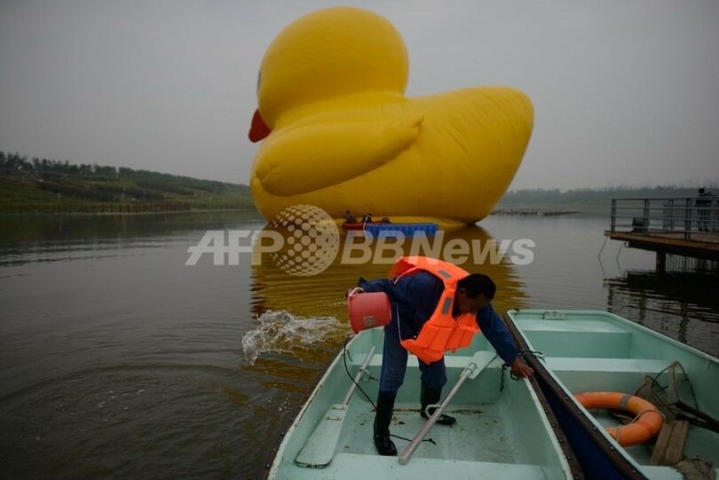 【9月7日 AFP】今年5月に香港(Hong Kong)で話題をさらい、中国各地で偽物が相次いで出現して物議を醸したアヒルのおもちゃの巨大アート「ラバー・ダック(Rubber Duck)」が6日、ついに北京(Beijing)に登場した。だが、本物のアヒルの中国本土初登場を歓迎する声がある一方で、観覧料を払わなければ見られないことに苦情も出ている。