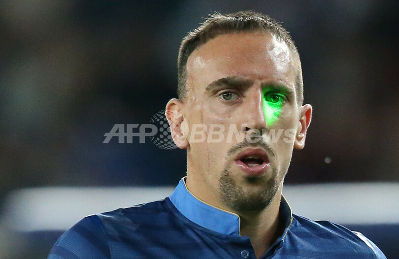 試合中にレーザー光線を受けるフランスのフランク・リベリ(Franck Ribery、2013年9月6日撮影)。(c)AFP/FRANCK FIFE