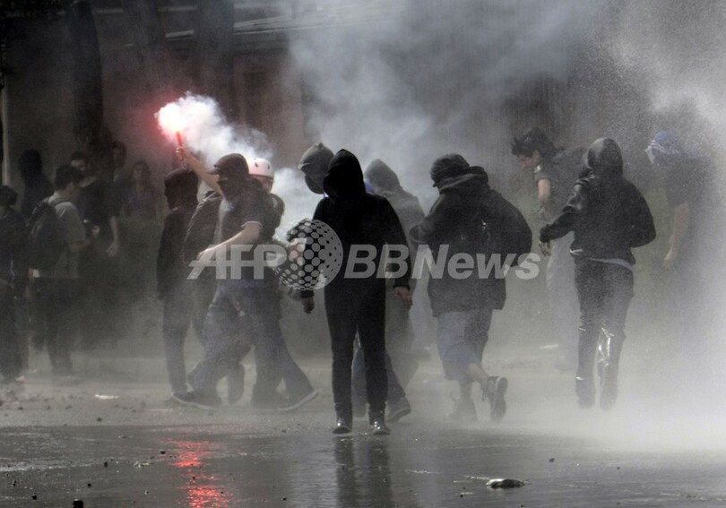 2時間にわたったデモ行進の後には、フードをかぶった参加者の一団がバリケードを設置し、警察機動隊と衝突。一部の警官はデモ隊から投石を受けたり、棒で殴られたりした。機動隊は催涙ガスや高圧放水砲などを使って鎮圧に当たった。(c)AFP