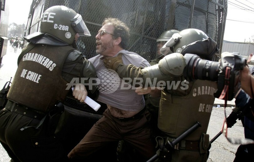 写真は、抗議デモの最中に身柄を拘束された男性(2013年9月8日撮影)。(c)AFP/Sebastian Silva