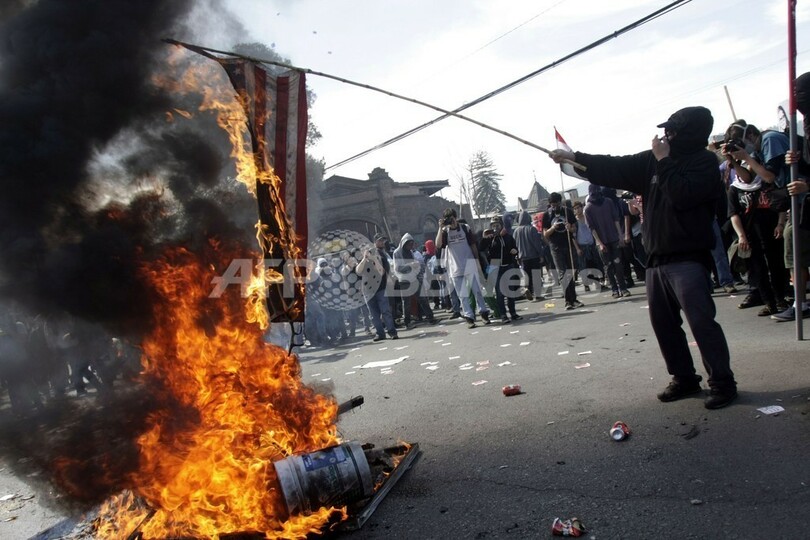 写真は、デモの最中に物に火を付けるデモ参加者(2013年9月8日撮影)。(c)AFP/Sebastian Silva