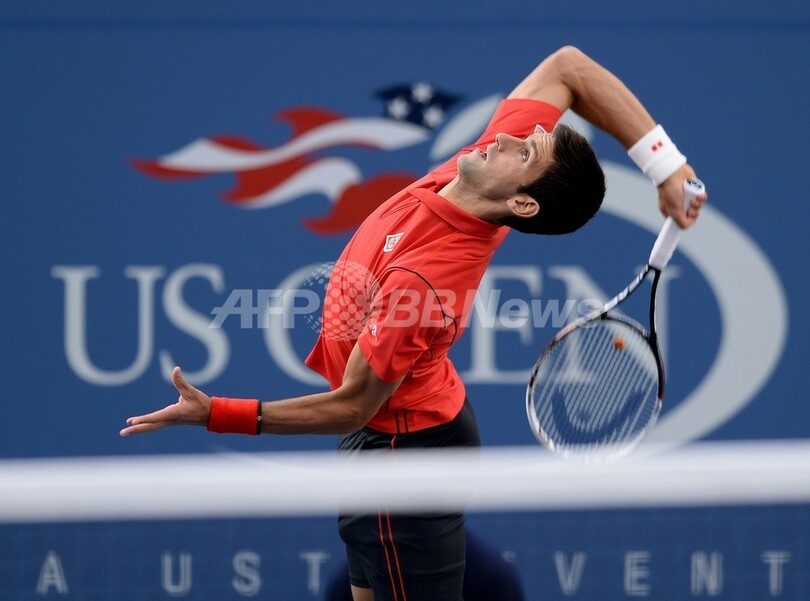 サーブを放つノバク・ジョコビッチ(2013年9月9日撮影)。(c)AFP/Stan HONDA