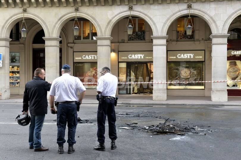事件は、高級店の立ち並ぶバンドーム広場(Place Vendome)近くにある宝飾店で発生。匿名を条件に取材に応じた警察筋によると、男らは同日朝の早い時間帯に大型の四輪駆動車で店に突っ込み、宝飾品類や高級時計を強奪。乗っていた車に放火し、別の車で逃走したという。