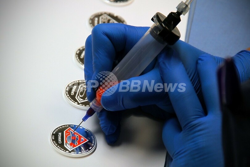 写真は色づけされる硬貨(2013年9月9日公開)。(c)AFP/ROYAL CANADIAN MINT