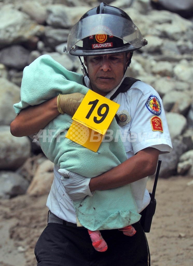 写真は、子どもの遺体を抱える消防士(2013年9月9日撮影)。(c)AFP/Johan ORDONEZ