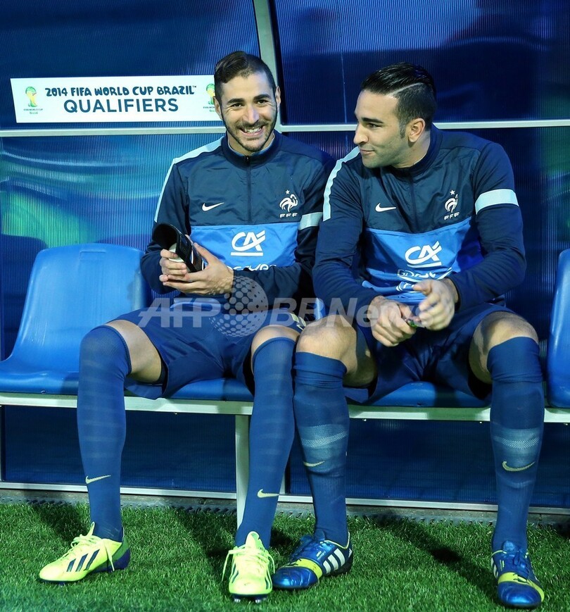 先発から外れ、アディル・ラミ(Adil Rami)と一緒にベンチに座るフランスのカリム・ベンゼマ(Karim Benzema、2013年9月10日撮影)。(c)AFP/FRANCK FIFE
