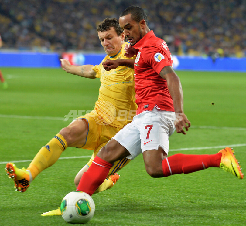 ウクライナのアルテム・フェデツキー( Artem Fedetskiy、奥)とボールを競るイングランドのテオ・ウォルコット(Theo Walcott、2013年9月10日撮影)。(c)AFP/SERGEI SUPINSKY