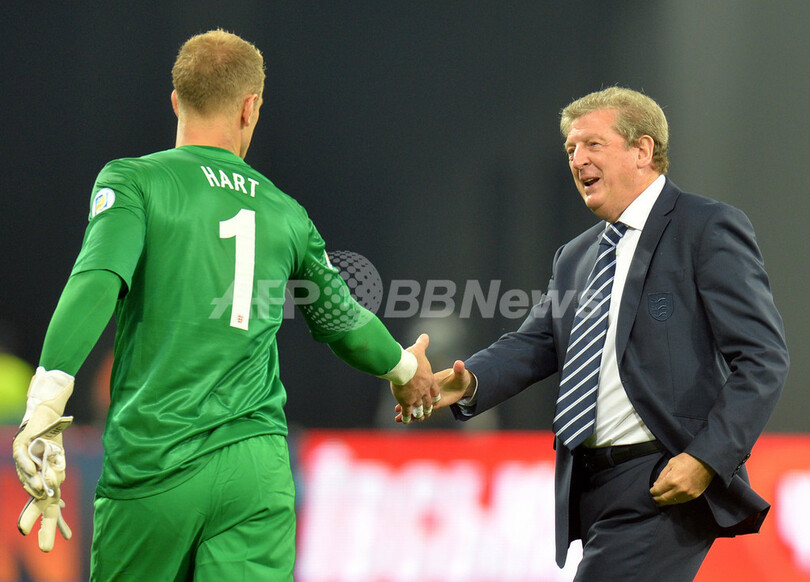 試合後、ロイ・ホジソン(RoyHodgson)監督(右)と握手を交わすイングランドのジョー・ハート(Joe Hart、2013年9月10日撮影)。(c)AFP/SERGEI SUPINSKY