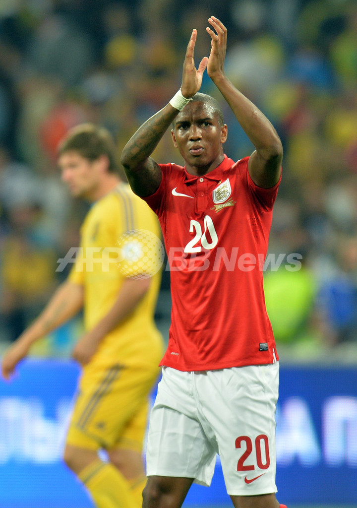 試合後、観衆の声援に応えるアシュリー・ヤング(Ashley Young、2013年9月10日撮影)。(c)AFP/SERGEI SUPINSKY