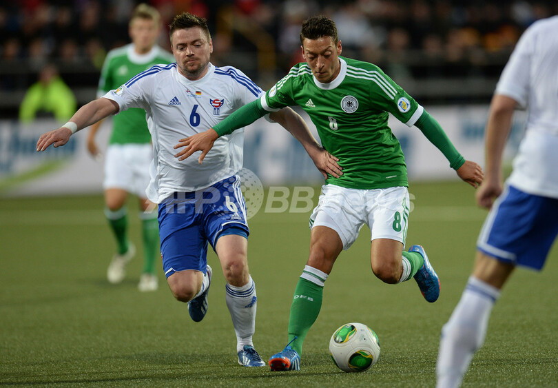フェロー諸島のスニ・オルセン(Suni Olsen、左)とボールを競るドイツのメスト・エジル(Mesut Ozil、2013年9月10日撮影)。(c)AFP/PATRIK STOLLARZ