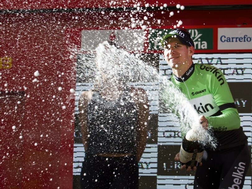 表彰台でステージ優勝を喜ぶベルキンのバウケ・モレッマ(2013年9月11日撮影)。(c)AFP/JAIME REINA