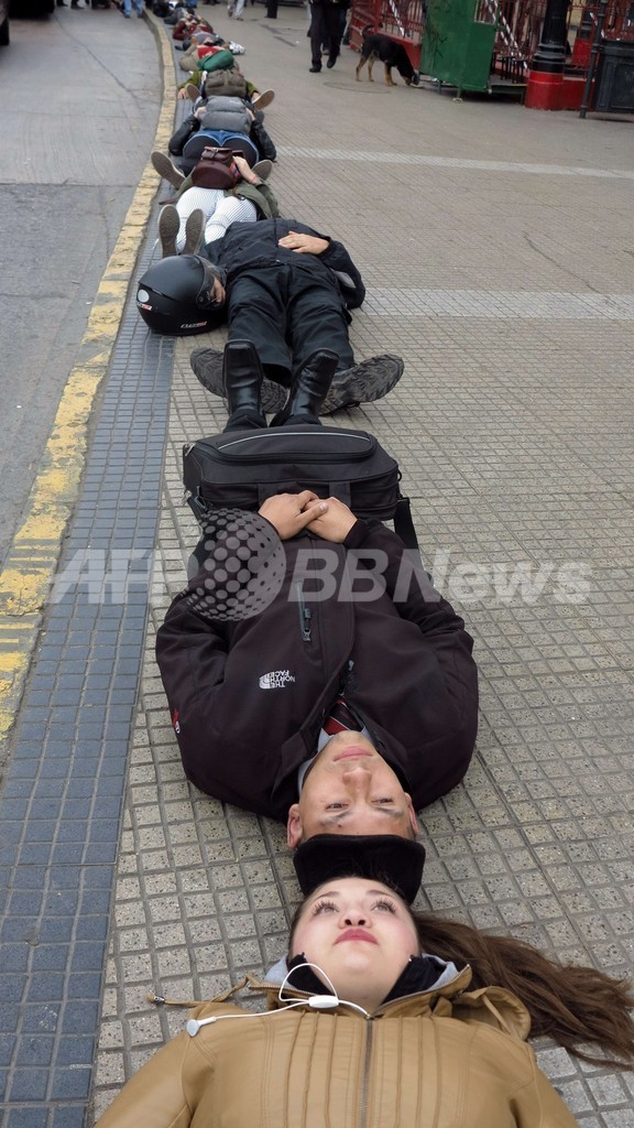 ピノチェト元大統領は裁判にかけられることなく2006 年に死亡、チリの司法制度の下ではピノチェト時代の犯罪に関わる約1300件が未解決となっている。 当時から1200人近くが行方不明のままであり、それを追悼して10日には約1000人が大統領府近くで地面に横たわった。(c)AFP