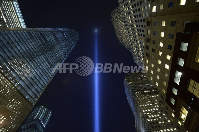 【9月13日 AFP】米同時多発テロから12年を迎えた11日、NPOの「ミュニシパル・アート・ソサエティー(Municipal Art Society)」の主催により、ニューヨーク(New York)で「追悼の光(Tribute in Light)」と題されたライト・ショーが開催された。世界貿易センター(World trade Center)跡地そばに設置された88個ものサーチライトによって、テロで崩壊した「ツインタワー」を追悼の意を込めて表現した2本の光の柱が夜空を照らした。(c)AFP