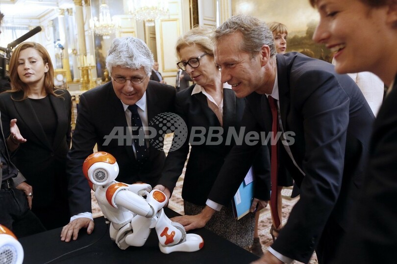 【9月14日 AFP】フランソワ・オランド(Francois Hollande)仏大統領は12日、パリ(Paris)のエリゼ宮(Elysee Palace、大統領府)で開催されたフランスの工業デザインとテクノロジーに関する展示会を訪れた。仏ベンチャー企業アルデバラン・ロボティックス(Aldebaran Robotics)が開発した人型ロボ「Nao」をオランド大統領が抱きかかえる場面もあった。(c)AFP