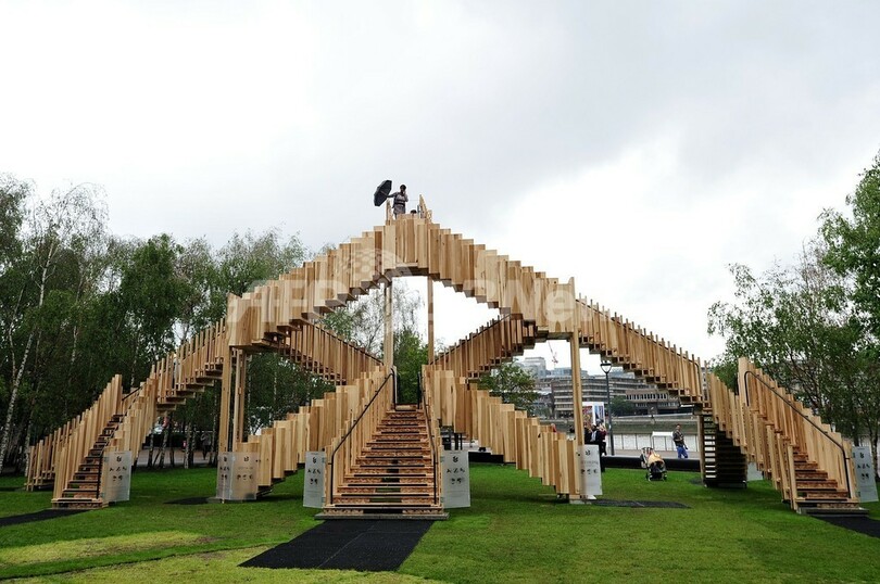 dRMMはロンドンに拠点を置く建築家とデザイナーのスタジオ。この階段は、14日から22日までの会期で開催されるロンドン・デザイン・フェスティバル(London Design Festival)のために設置された作品で、マウリッツ・コルネリス・エッシャー(Maurits Cornelis Escher)の有名なだまし絵からインスピレーションを得たという。(c)AFP