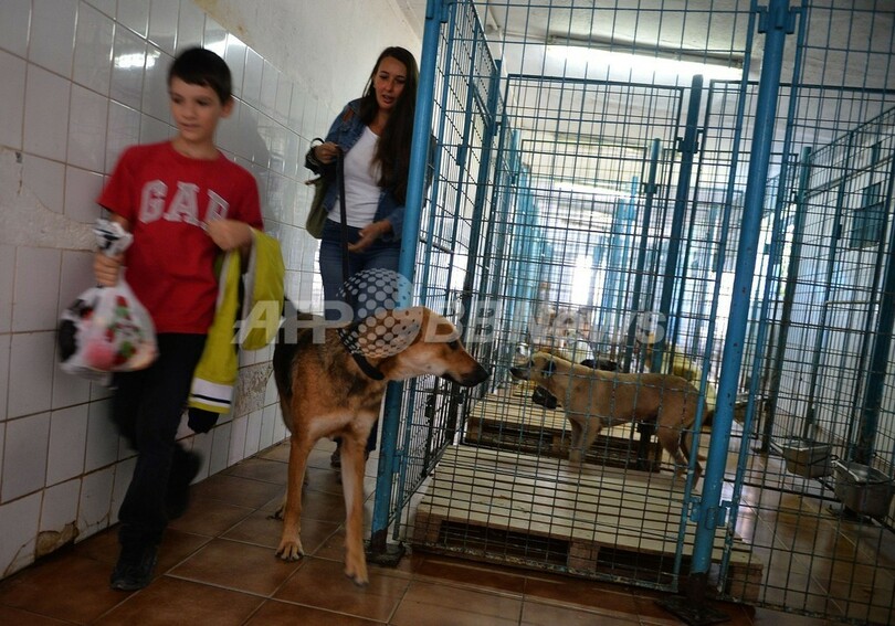 写真は、ブカレストの公設動物保護施設で、犬を引き取って帰る人たち(2013年9月13日撮影)。(c)AFP/DANIEL MIHAILESCU
