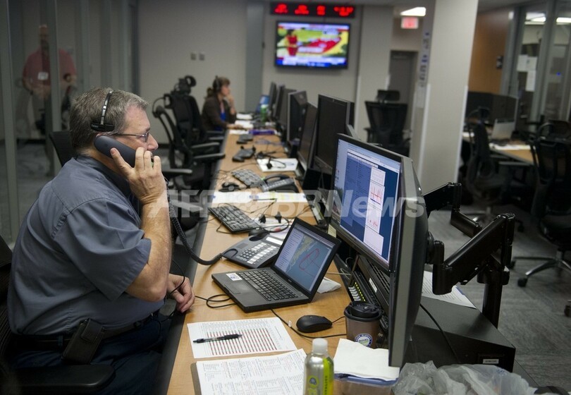 写真は、ワロップス飛行施設のミッション管制センターでグローバル・ホークを監視するパイロットや科学者ら(2013年9月10日撮影)。(c)AFP/Saul LOEB
