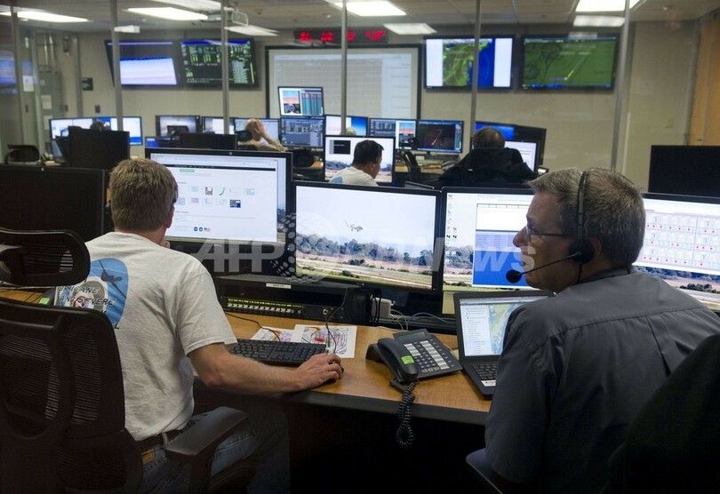 写真は、ワロップス飛行施設のミッション管制センターでグローバル・ホークを監視するパイロットや科学者ら(2013年9月10日撮影)。(c)AFP/Saul LOEB