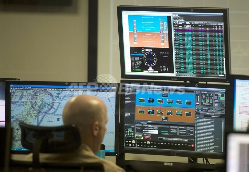 写真は、ワロップス飛行施設のミッション管制センターでグローバル・ホークを遠隔操縦するパイロット(2013年9月10日撮影)。(c)AFP/Saul LOEB