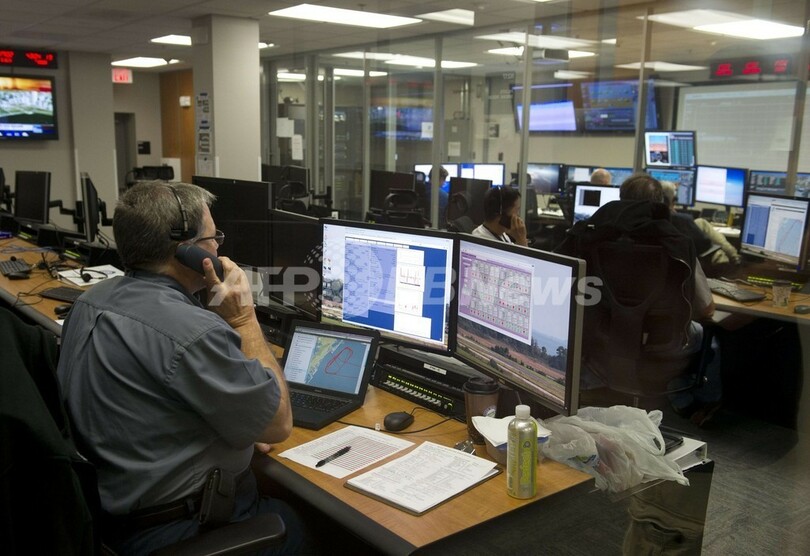 写真は、ワロップス飛行施設のミッション管制センターでグローバル・ホークを監視するパイロットや科学者ら(2013年9月10日撮影)。(c)AFP/Saul LOEB