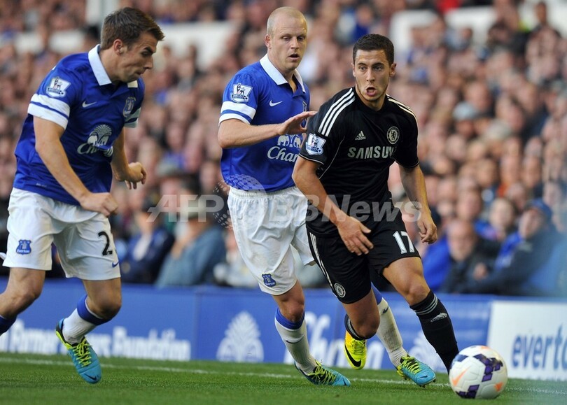 エバートンのスティーヴン・ネイスミス(Steven Naismith、中央)の前でボールをコントロールするチェルシーのエデン・アザール(Eden Hazard、右、2013年9月14日撮影)。(c)AFP/PAUL ELLIS