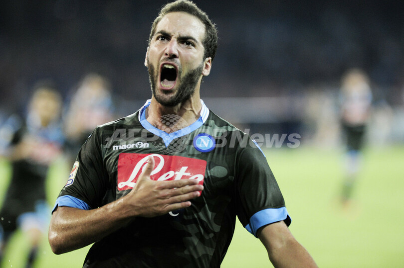 後半26分に先制点を挙げて喜ぶナポリのゴンサロ・イグアイン(Gonzalo Higuain、2013年9月14日撮影)。(c)AFP/CARLO HERMANN