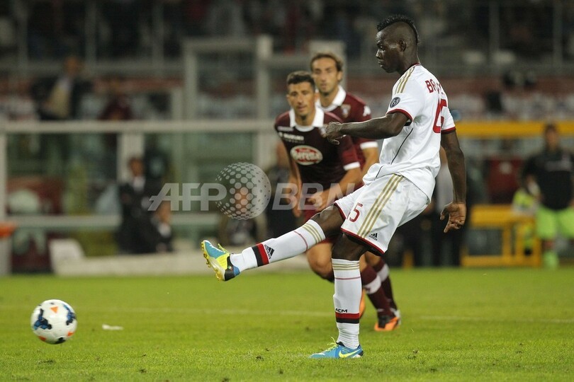 後半ロスタイムに同点に追いつくPKを決めるACミランのマリオ・バロテッリ(Mario Barwauh Balotelli、2013年9月14日撮影)。(c)AFP/MARCO BERTORELLO