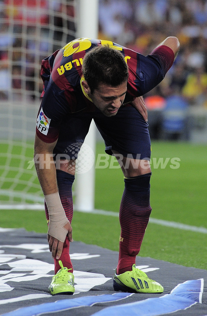 負傷したFCバルセロナのジョルディ・アルバ(Jordi Alba、2013年9月14日撮影)。(c)AFP/JOSEP LAGO