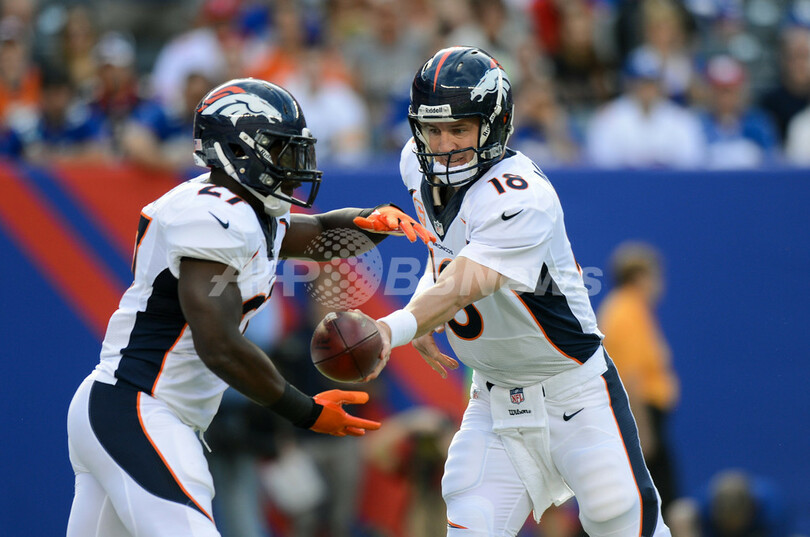 チームメートのノーション・モレノ(Knowshon Moreno、左)にハンドオフするデンバー・ブロンコスのペイトン・マニング(Peyton Manning、2013年9月15日撮影)。(c)AFP/Getty Images/Ron Antonelli